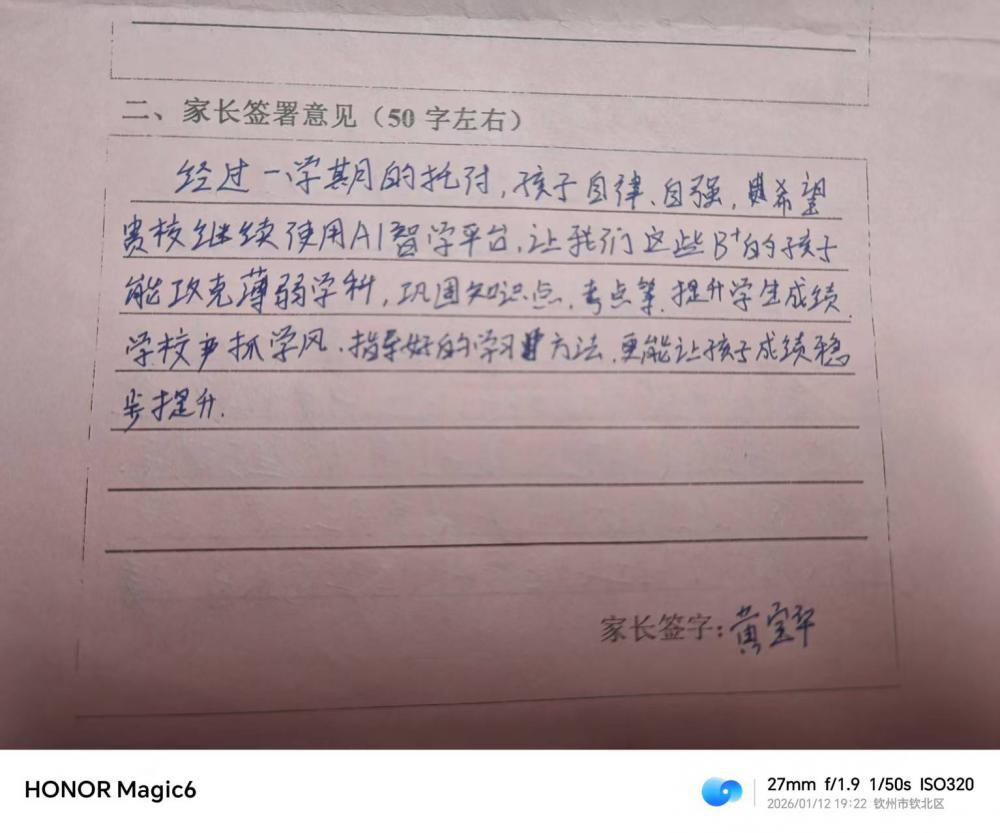 “经过一学期的托付,孩子自律、自强,希望贵校继续使用AI智学平台,让我们这些B+的孩子能攻克薄弱科目,巩固知识点,提升学生成绩!”B + 等级学生家长黄先生感慨。A +等级学生家长梁先生说:“我们家长深信,在学校的专业引领和家庭的共同努力下,学生必成为学识扎实和勇于担当的时代青年。”A 等级学生家长章女士说:“借助培优补差、周末托管,掌控假期,有AI助力,必能实现弯道超车。”B 等级林同学妈妈留言:“回家的每一次和她谈话中都能感受到她的进步,也印证了学校的校训“纳平凡学子,成不凡英才。”路虽远,行则将至,让她在贵校完成一个大学梦!” 还有家长点赞:“AI 智学精准补弱,周末托管解决辅导难题,跟着学校节奏,孩子的本科梦更有底气!”