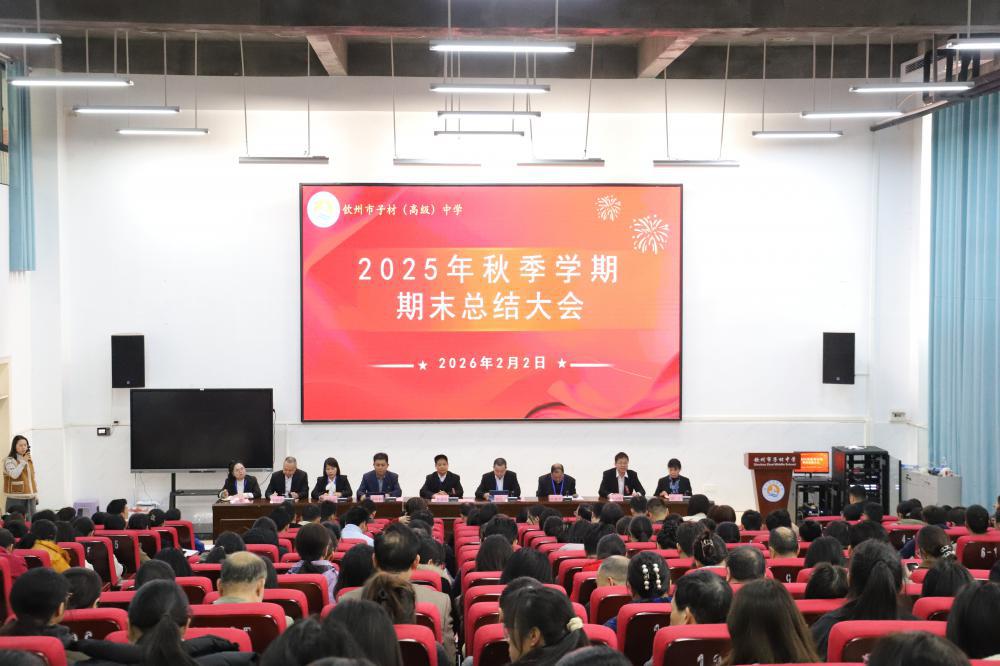 寒梅吐蕊迎新春,硕果盈枝话奋进。2026年2月2日上午,钦州市子材中学报告厅内暖意融融、气氛庄重,2025年秋季学期期末总结大会在此隆重举行。全体教职工齐聚一堂,共同回顾学期以来的奋斗历程,总结成效与经验,查摆问题与不足,部署新学期发展蓝图。大会由副校长唐国镇主持,党总支部书记、副校长陈世松,校长陈静兴出席并发表讲话。