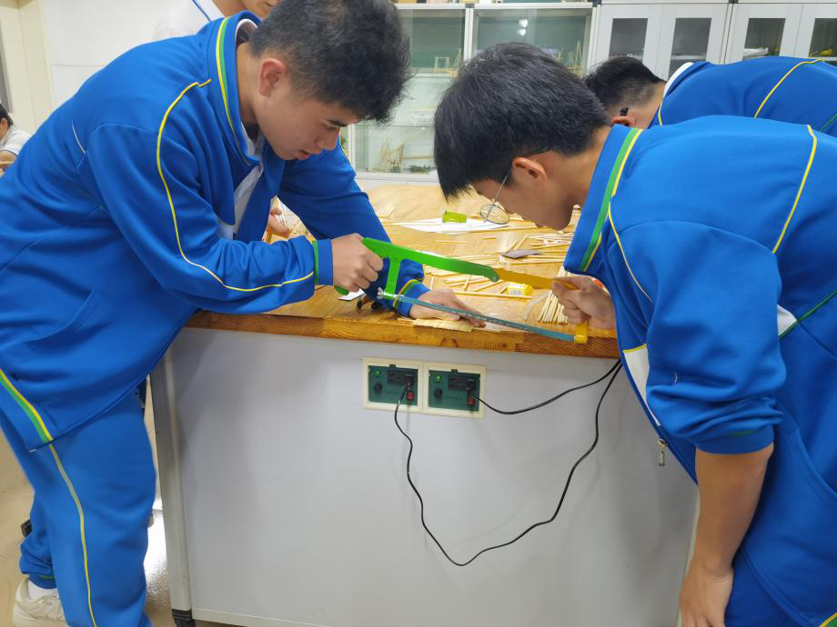 比赛启动后,高二年级全体学生踊跃参与,在通用技术课堂时间制作,部分小组携手奔赴通用技术实验室。午休的片刻静谧、晚自习的灯火阑珊,实验室成了他们逐梦的阵地。竹签在指尖翻飞切割,硬纸板经巧手塑形拼接,为了优化结构稳定性,他们反复推演受力逻辑;为了打磨细节质感,他们用砂纸细细打磨每一处接口;为了还原桥梁功能,他们一次次拆解重组、调试机关。深夜实验室里的灯光、散落的工具碎屑、反复修改的设计图纸,皆是少年们对科创的赤诚与执着。