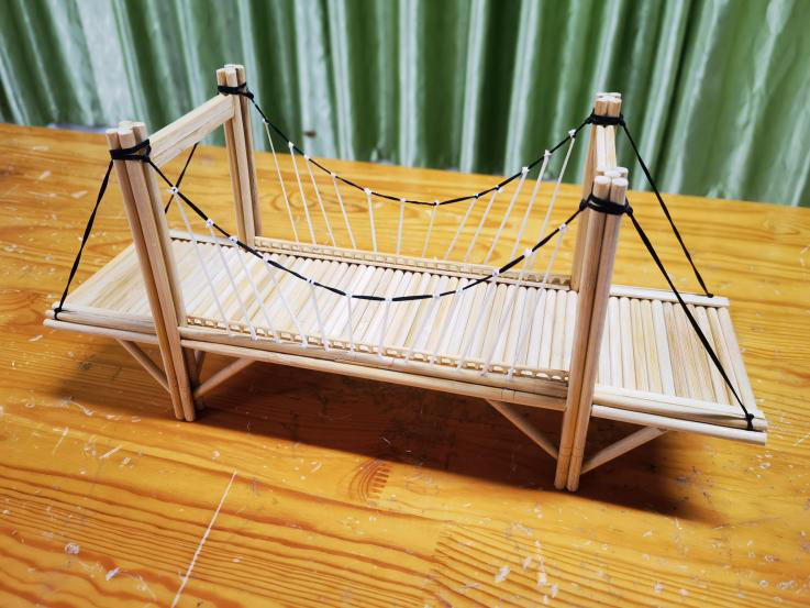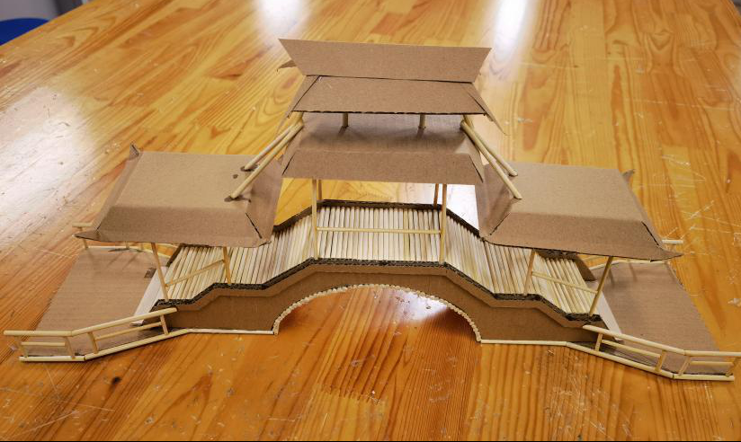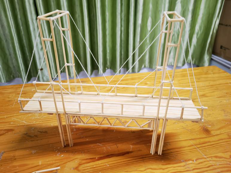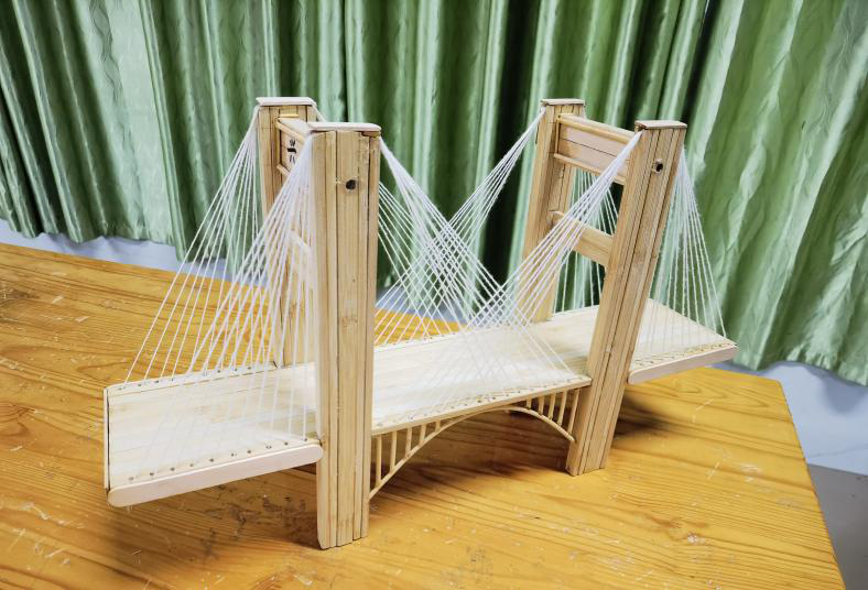 梁桥的沉稳规整、拱桥的弧度优美、斜拉桥的精巧通透,不同结构的模型相继成型,每一件作品都凝聚着课余时光的深耕细作,每一处细节都彰显着少年们的巧思与匠心。其中,高二(11)班黄承添、李心怡、李雨晨小组模拟伦敦塔桥模型制作的桥梁更是惊艳全场——以竹签为骨架,还原了伦敦塔桥的经典造型,通过内置旋转机关与棉线牵引,桥面可缓缓断开、灵活开合,完美复刻了这座百年名桥的通航功能,创意巧思与工程巧技令人叹服。
