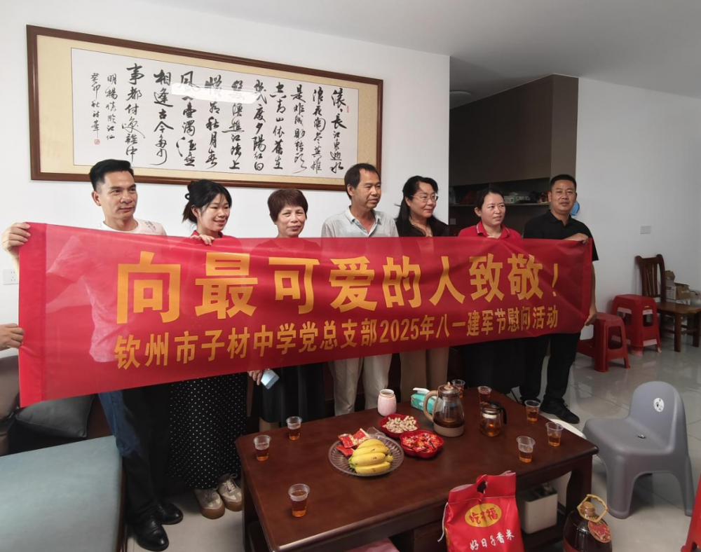 在中国人民解放军建军98周年之际,为深入贯彻落实习近平总书记关于退役军人工作的重要论述,传承红色基因,弘扬拥军优属优良传统,钦州市子材中学党总支部联合市退役军人事务局、市爱国拥军促进会组成慰问组,于8月1日共同开展2025年“八一”建军节走访慰问活动。作为以民族英雄命名的学校,我们以“自强不息,立己达人”的校训为指引,让师生在与老英雄的面对面交流中,体悟“躬行”之道,传承红色基因。