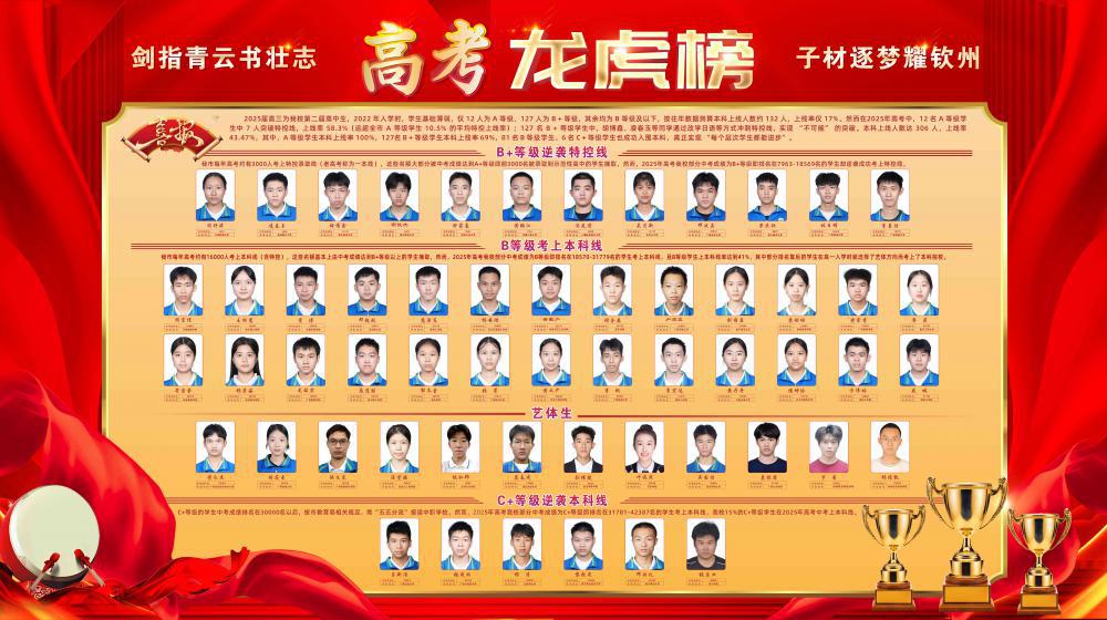 2025届高考我校有708名考生参加考试,有35人考上特控、307人考上本科、7人考入985院校、9人跻身211院校,更有学子考入北京大学。在34名A等级学生中有叶祖政等13名学生考上特控;159名原中考成绩为B+等级学生中有张原暢等22名学生考上特控,特控上线率达14%,还有115人考上本科,本科上线率高达72%,实现了“B+等级来子材基本都能考上本科”的目标;447名原中考成绩为B等级的学生中有134人圆梦本科,本科上线率达到30%,创造了不可能中的可能;甚至118名原中考成绩仅为C+等级的学生中有26人考上本科,本科上线率高达22%。