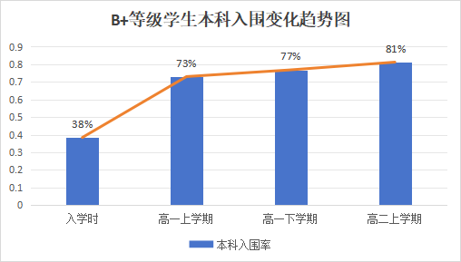 从三个学期的期末统考成绩来看,有183人三次考试均能稳定入围本科线的,有217人两次入围本科线。充分证明我校针对B+等级学生量身打造的培养体系定位精准、措施有效,通过科学培养能够实现学业跨越式提升。