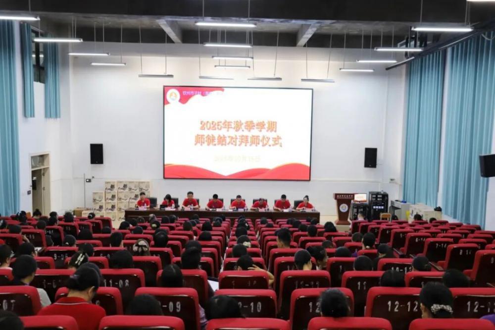 2025年10月15日晚,钦州市子材中学报告厅内洋溢着温馨而庄重的氛围,2025-2026学年师徒结对拜师仪式在此隆重举行。学校领导、科研处成员以及本年度结对的师傅和徒弟共同参与了这一重要活动。